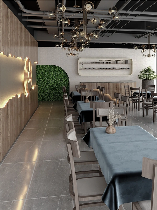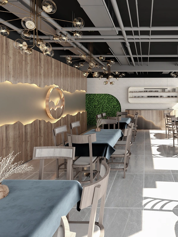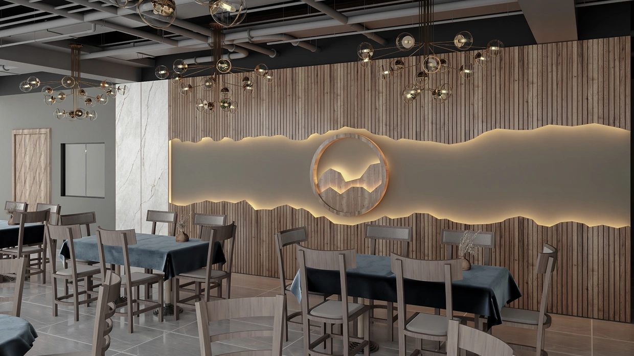 A modern café with illuminated wooden feature walls, deep blue seating, a curved wooden bar, gold chandeliers, and an outdoor area with geometric facades and cozy furniture, blending elegance with comfort.