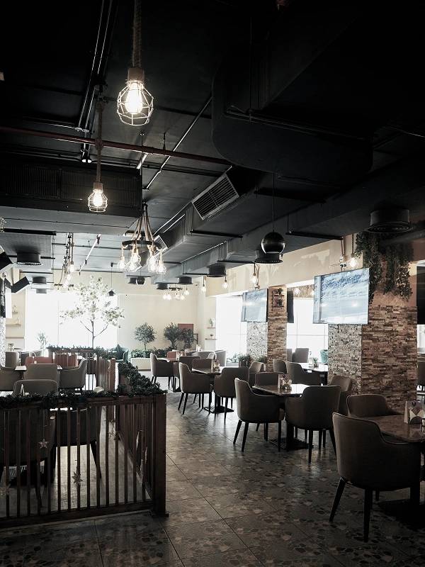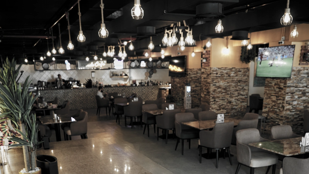 A stylish café and restaurant blending simplicity with elegance. It includes a cozy café area with neutral tones, a refined dining space with wood finishes, a sleek bar with ambient lighting, and diverse flooring to create visual harmony.