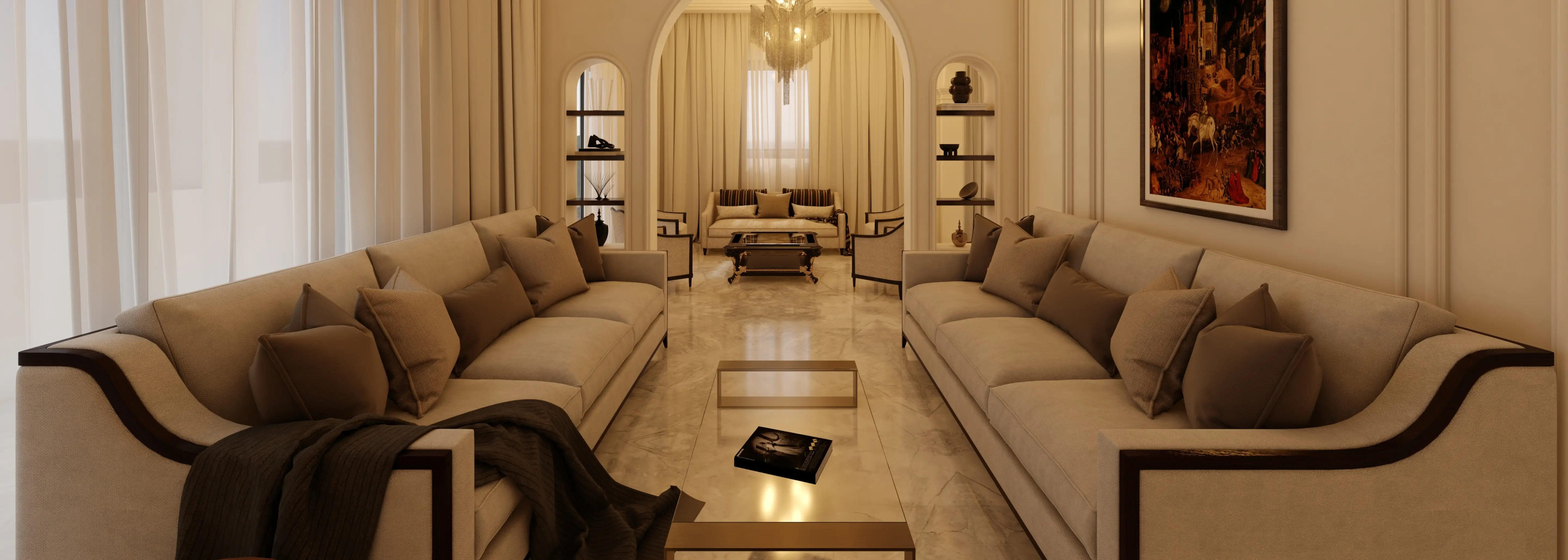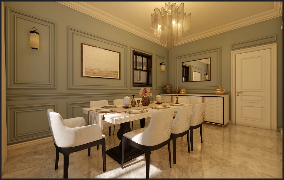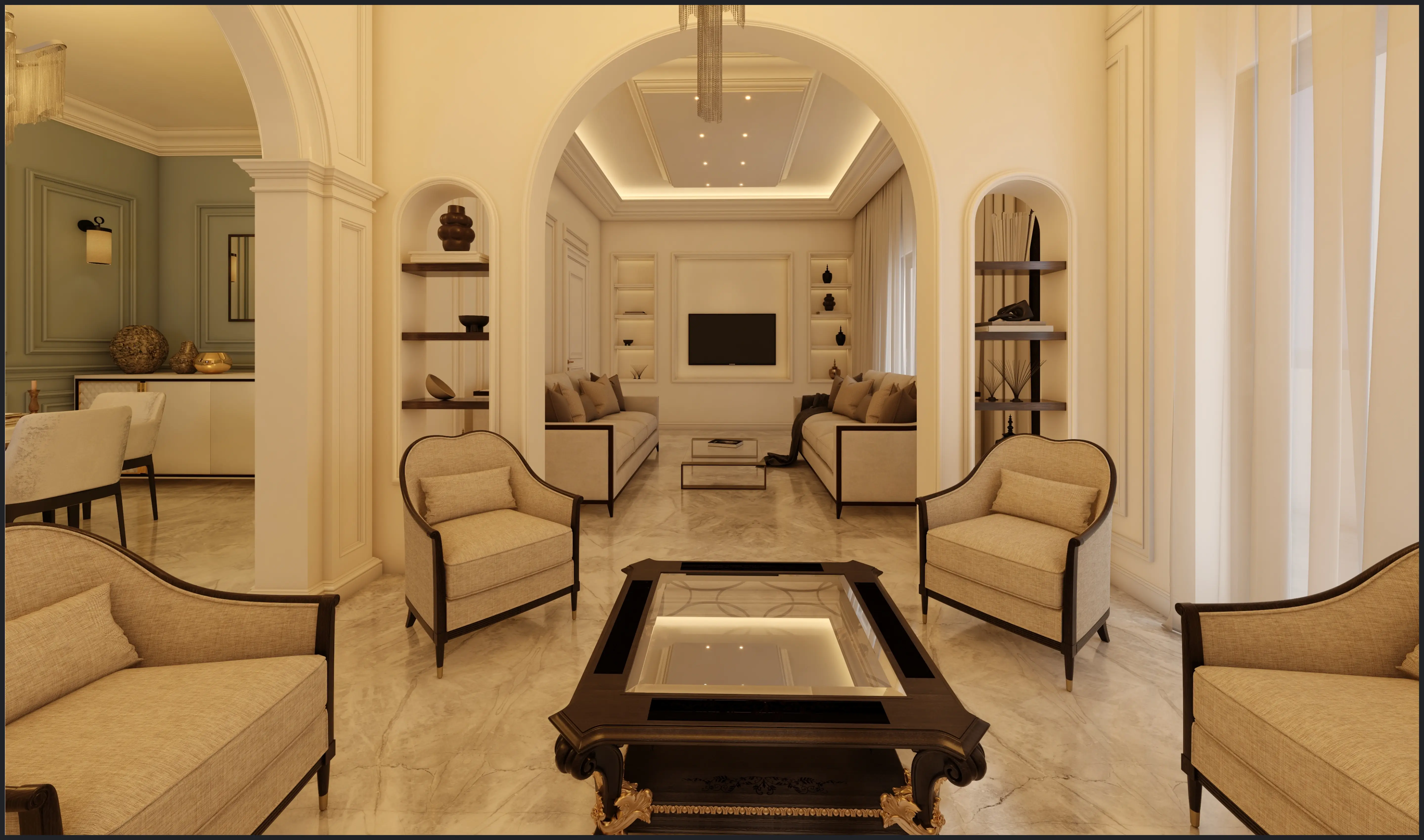 The project comprises the full interior design of Apartment 202 in Lebanon, developed in a refined classic style with a warm neutral palette. The spaces feature marble flooring, detailed wall mouldings, and soft indirect ceiling lighting that enhances the calm atmosphere. Furnishings in beige and taupe are accented with dark wood and brass details, while touches of muted green and patterned tiles add character to selected areas. The overall composition creates a cohesive, elegant home with a balanced blend of traditional detailing and contemporary comfort.