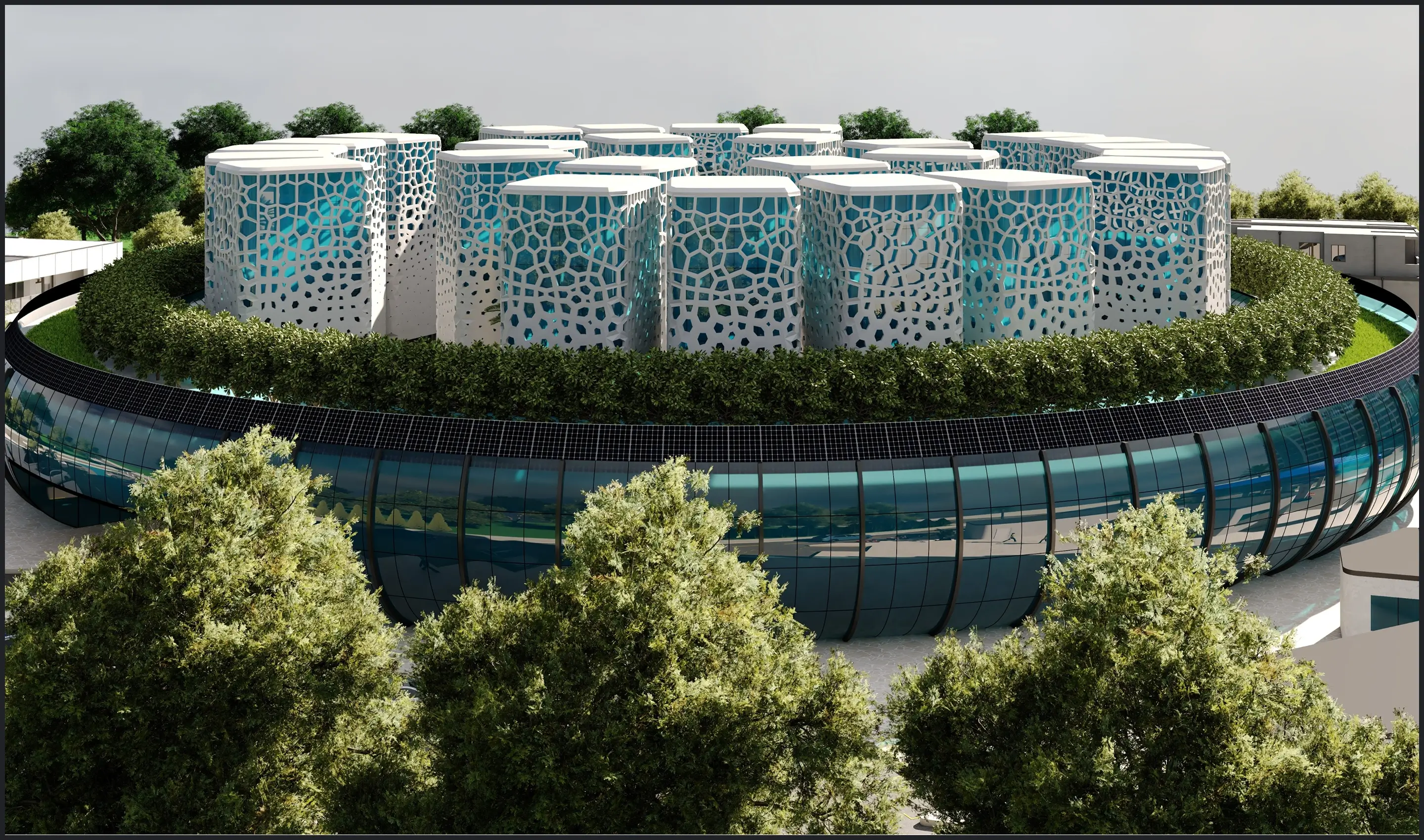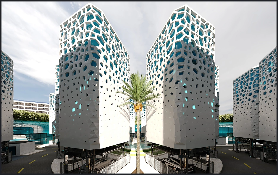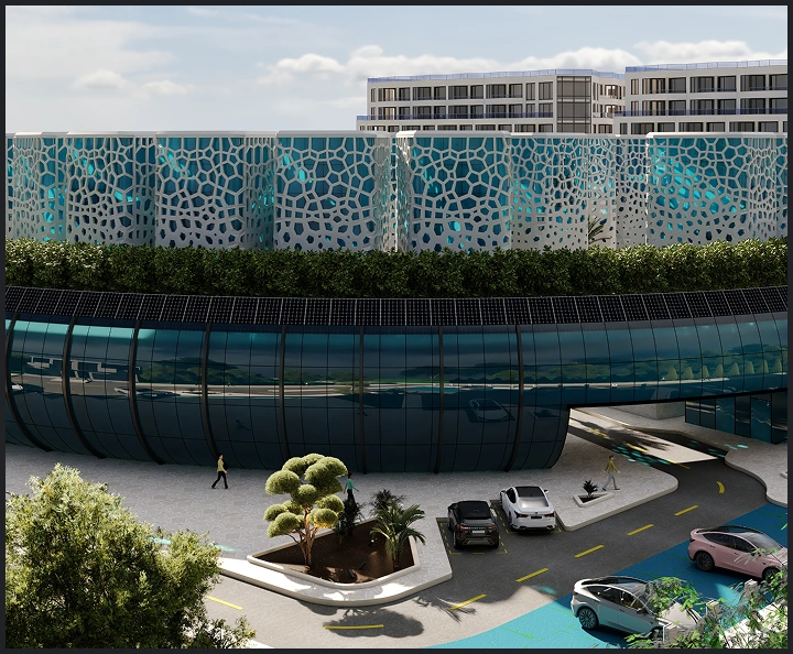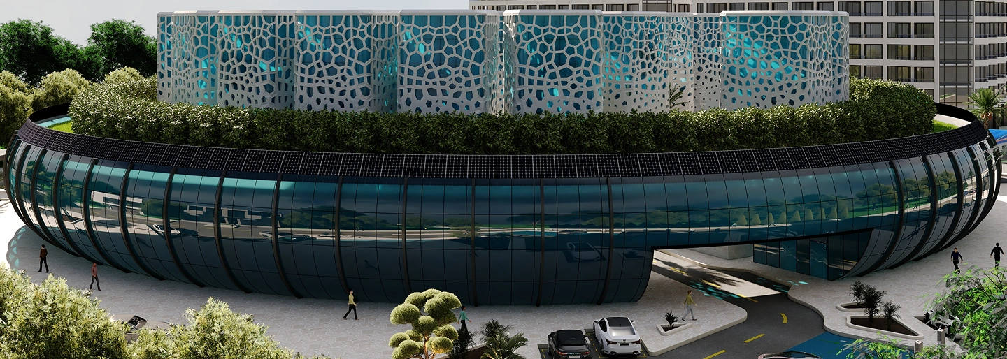 A futuristic office complex integrating a circular main building for offices and smart parking towers with a distinctive hexagonal facade. The design combines modern architecture, sustainable elements, and innovative automated parking solutions, ensuring efficiency and a visually striking presence.