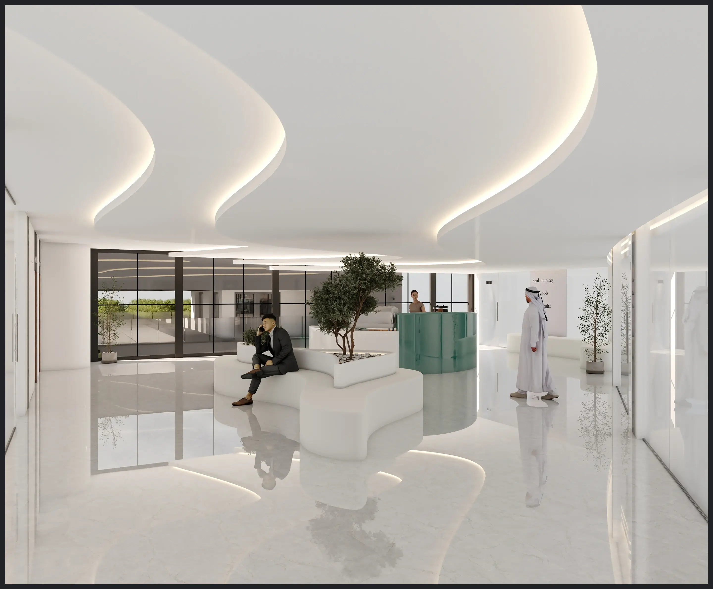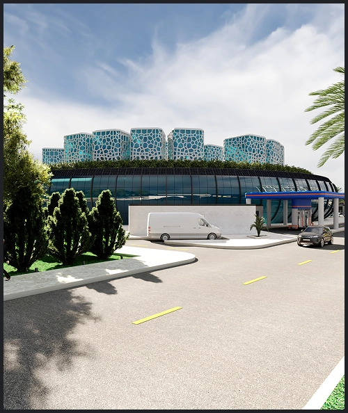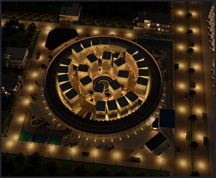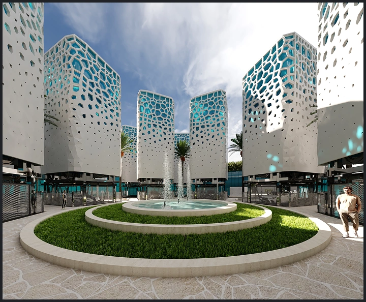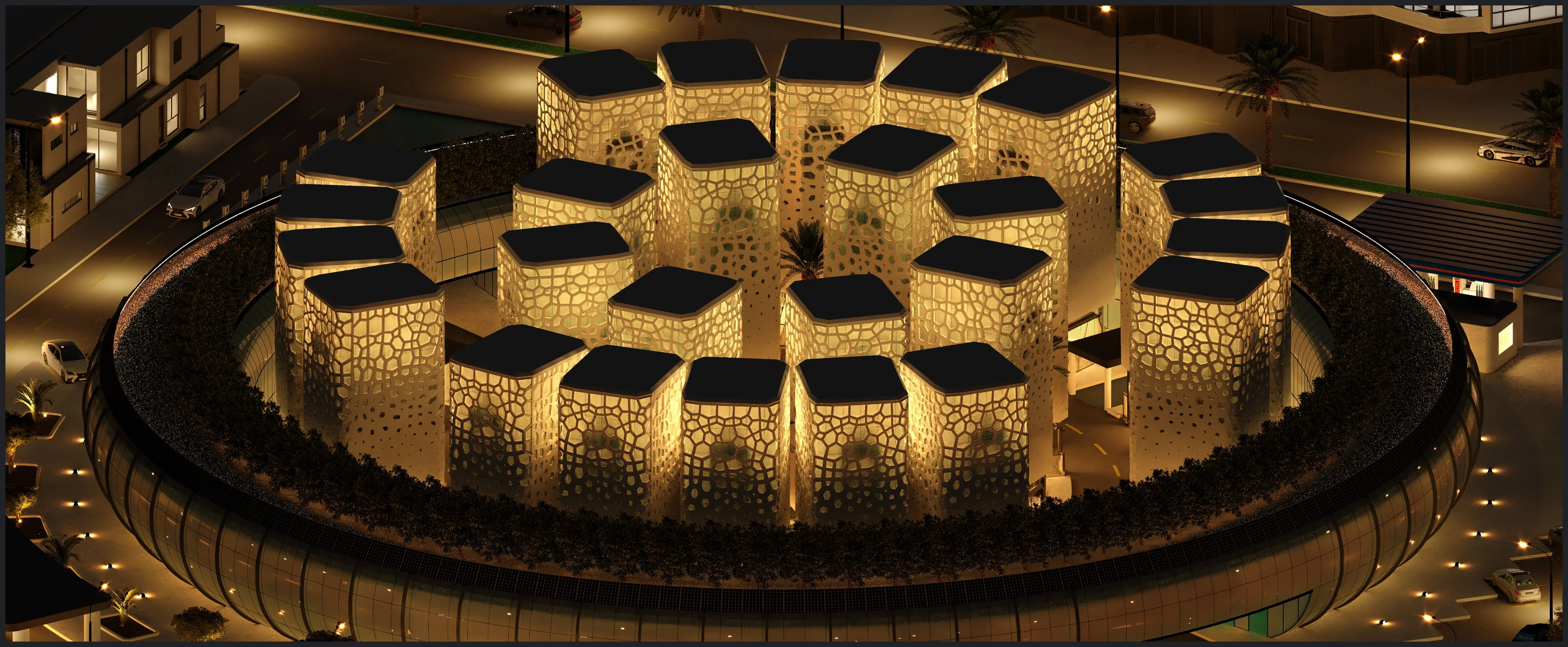A futuristic office complex integrating a circular main building for offices and smart parking towers with a distinctive hexagonal facade. The design combines modern architecture, sustainable elements, and innovative automated parking solutions, ensuring efficiency and a visually striking presence.