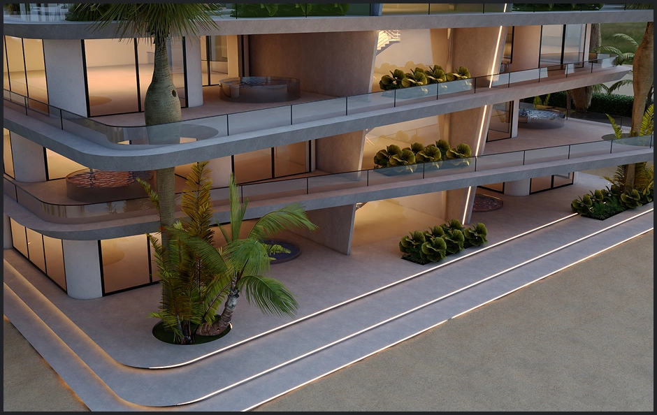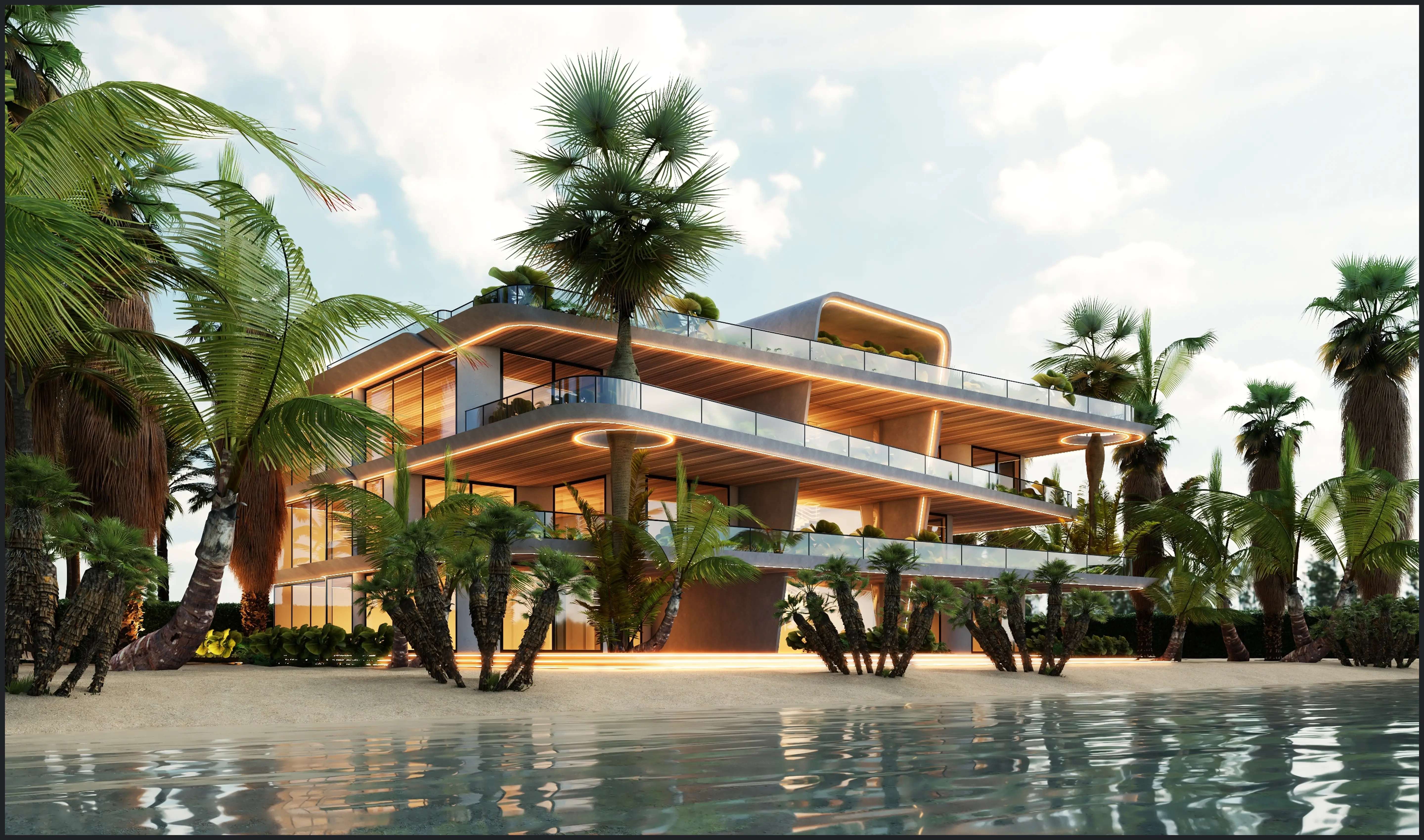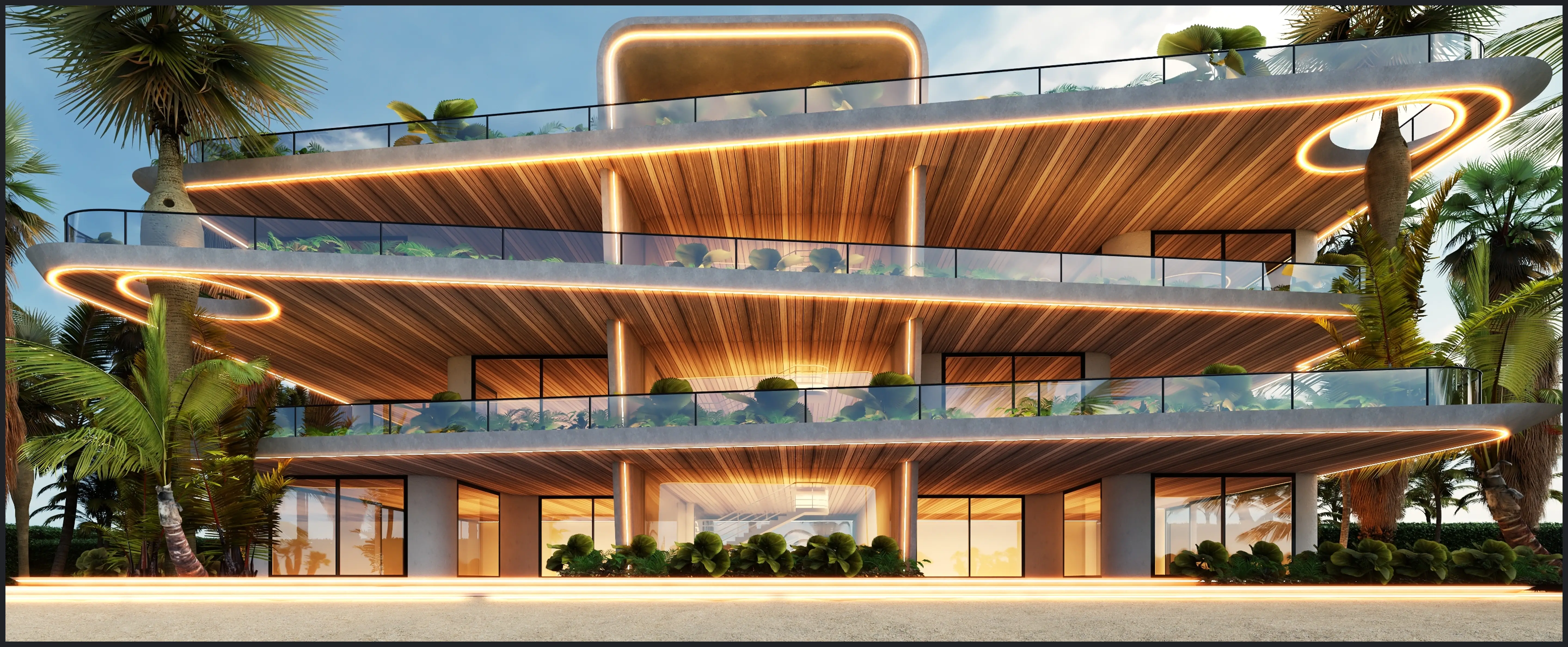 A contemporary architectural masterpiece with ocean-inspired curved structures, glass facades for seamless indoor-outdoor flow, panoramic terraces, and a sustainable luxury design integrating natural materials like wood and greenery.
