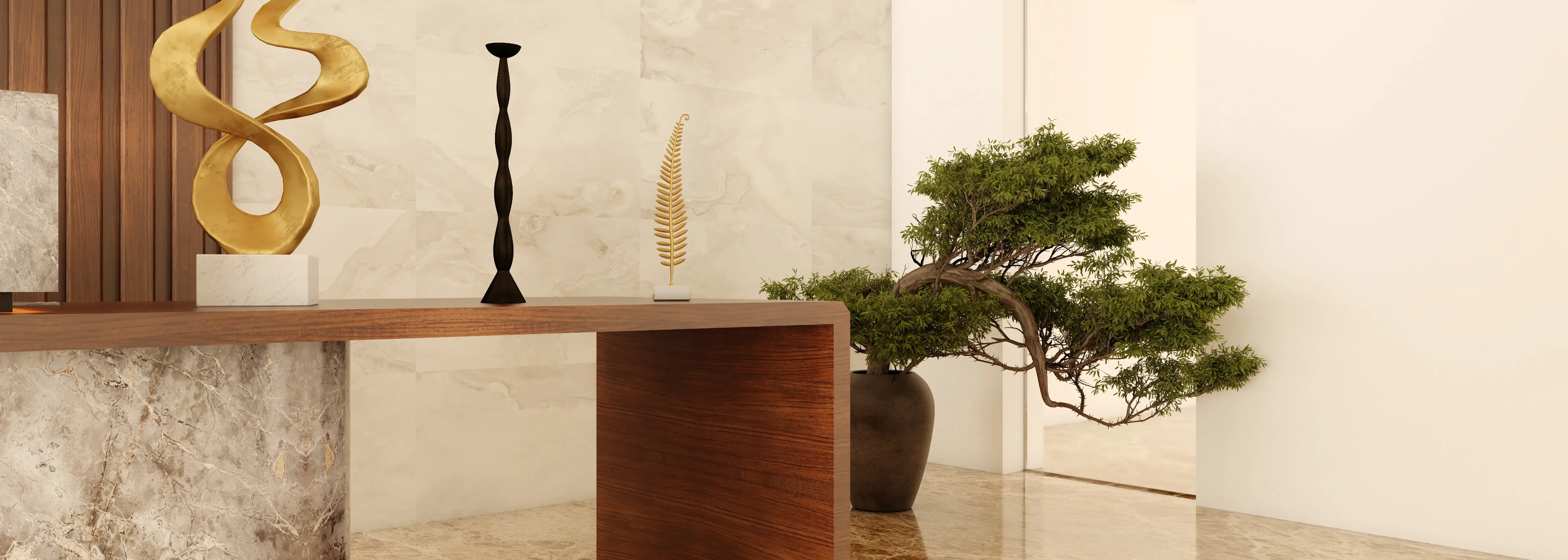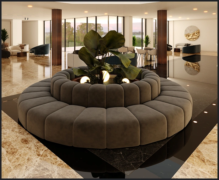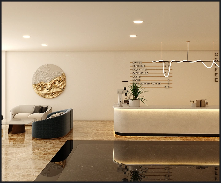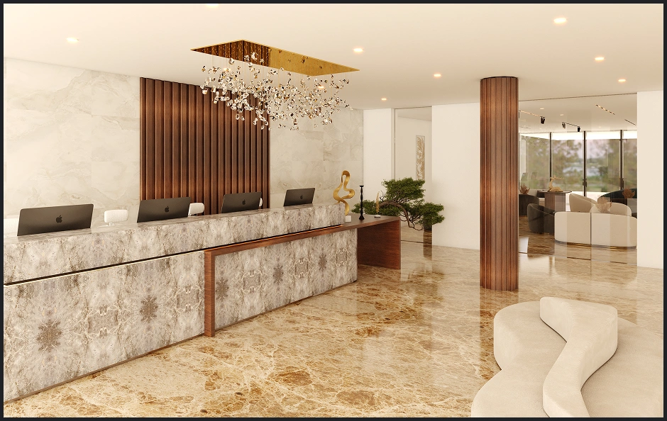 Metropolitan Al Mafraq Hotel (Abu Dhabi) The project includes the design of the reception area, lobby, and coffee lounge at Metropolitan Al Mafraq Hotel. The reception features natural stone with geometric patterns, a vertical wooden backdrop, and a suspended crystal lighting fixture that adds a refined visual focus. The lobby offers an open layout with polished marble flooring and a well-organized seating arrangement using sofas and armchairs in neutral tones such as beige, grey, and navy, complemented by dark wood-clad columns that add warmth to the space. The coffee lounge is designed in a modern style with a soft-edged white counter, under-counter lighting, and a sculptural linear pendant light, alongside a variety of seating options facing the full-height glass façade.