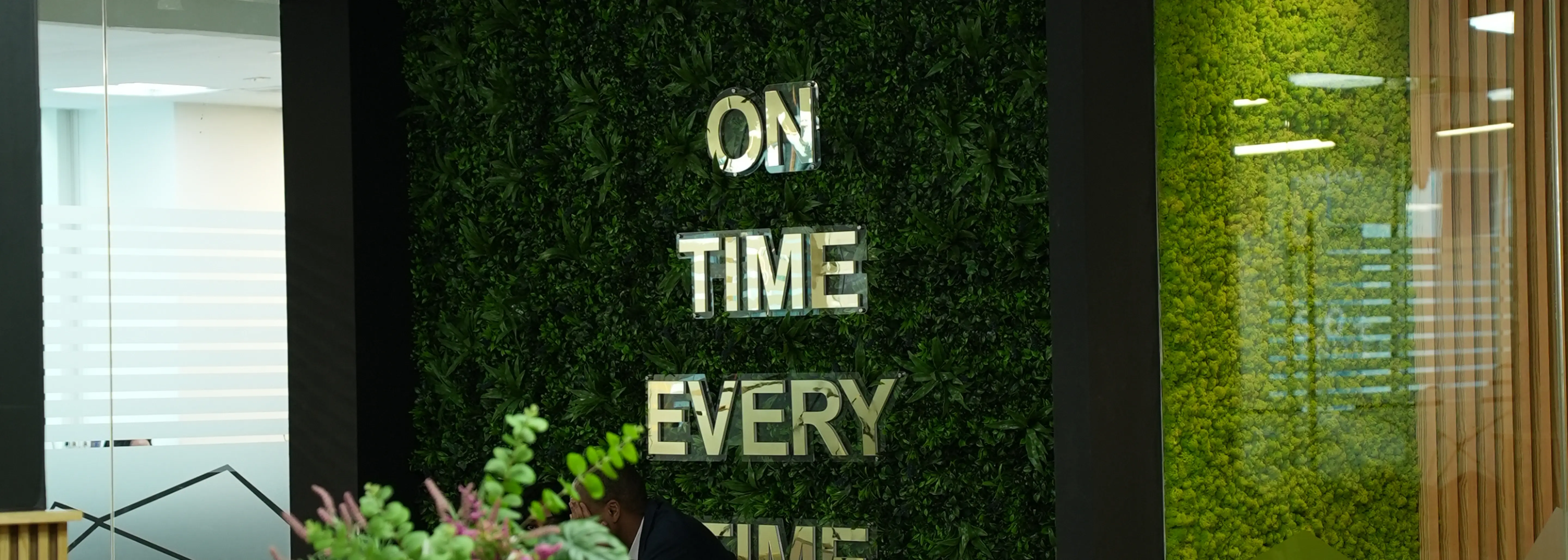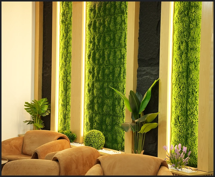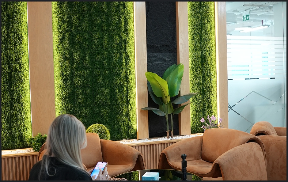 A luxury showroom inspired by the Maldives, featuring a wooden ceiling with LED lighting, an open layout with light wood flooring, a wave-like wooden reception desk, and a green wall that enhances the natural-modern balance.