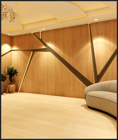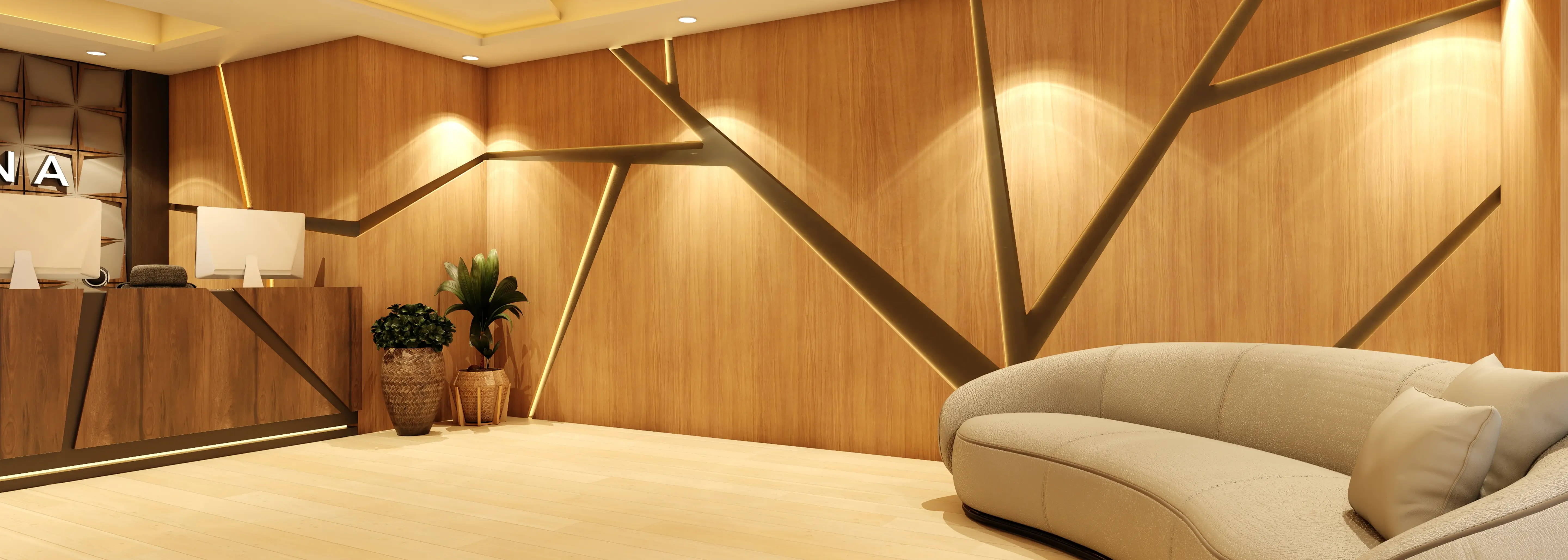 A modern luxury reception space featuring warm wooden paneling with sculptural geometric inlays, soft ambient lighting, a statement lattice backdrop behind the desk, and elegant contemporary furnishings. The design blends natural textures, artistic wall detailing, and refined ceiling accents to create a welcoming yet upscale atmosphere that sets the tone for a sophisticated guest experience.
