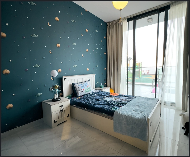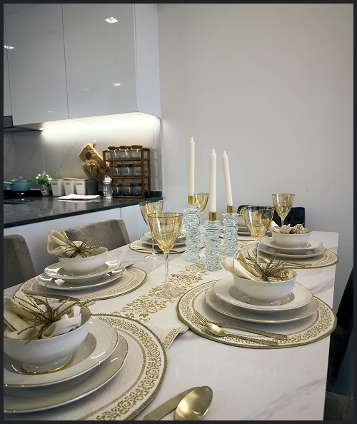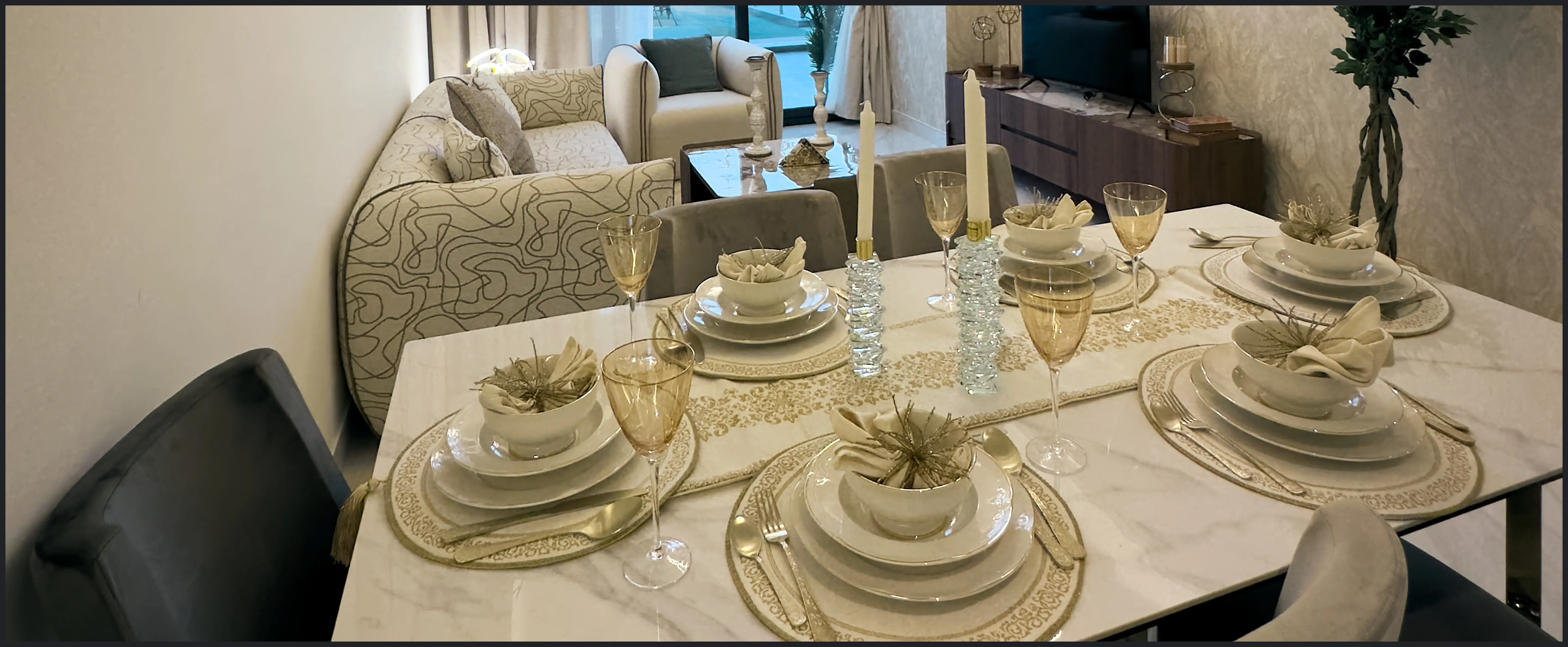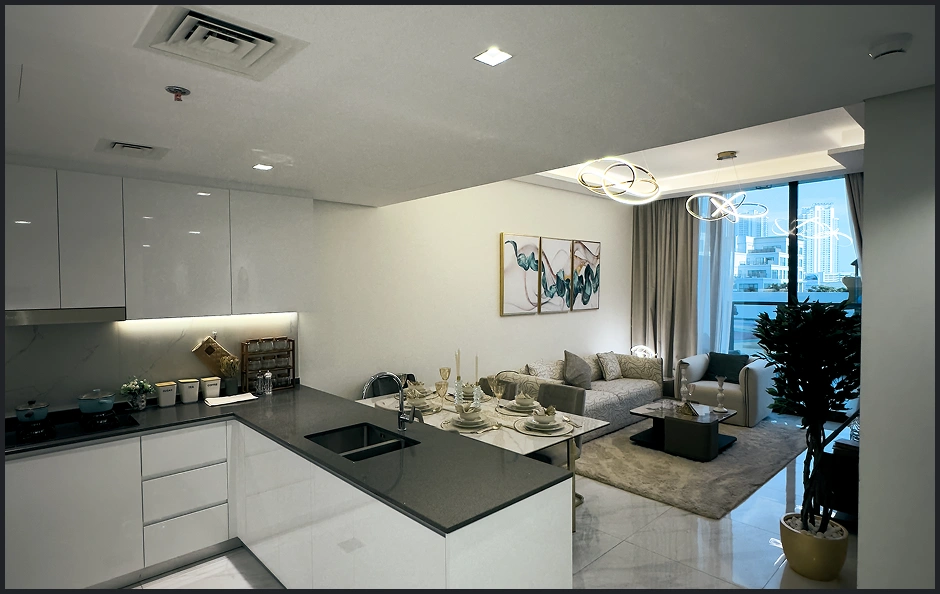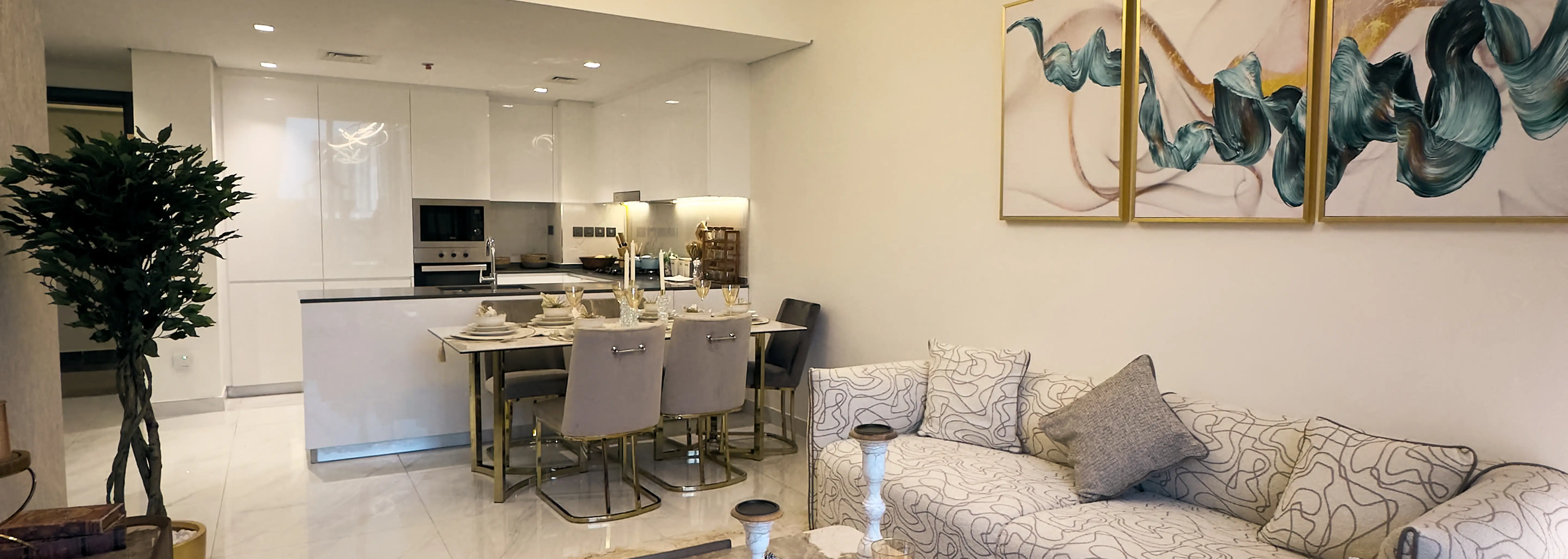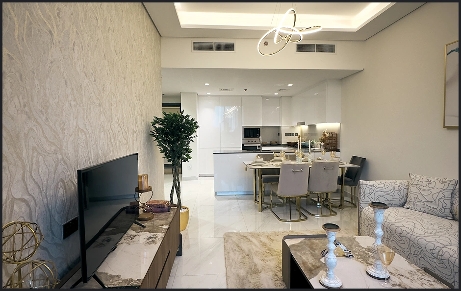 A fully furnished show apartment that showcases luxury and modern living. It includes stylish furniture, wallpaper installations, and an outdoor poolside lounge with artificial greenery to create a sophisticated atmosphere for potential buyers.