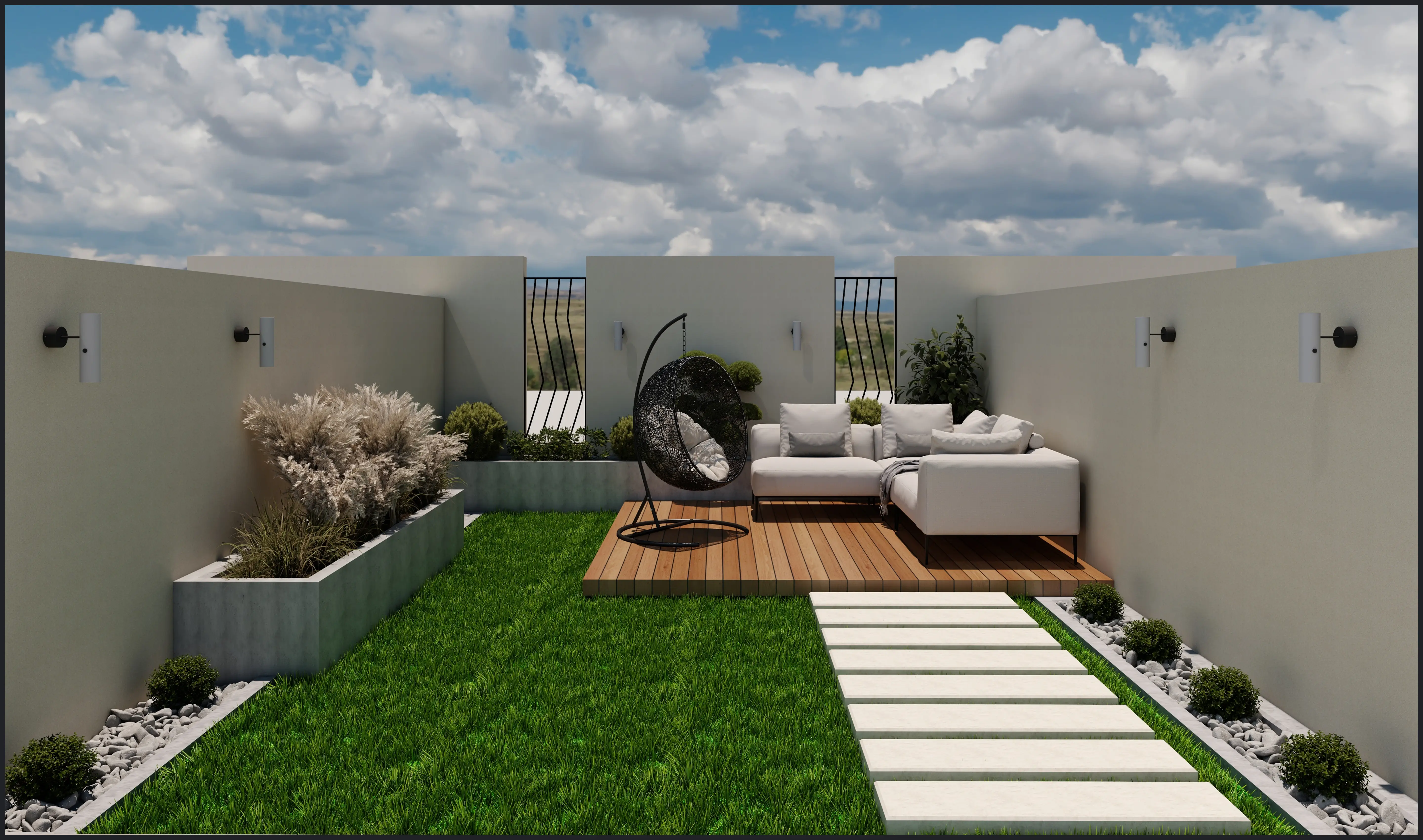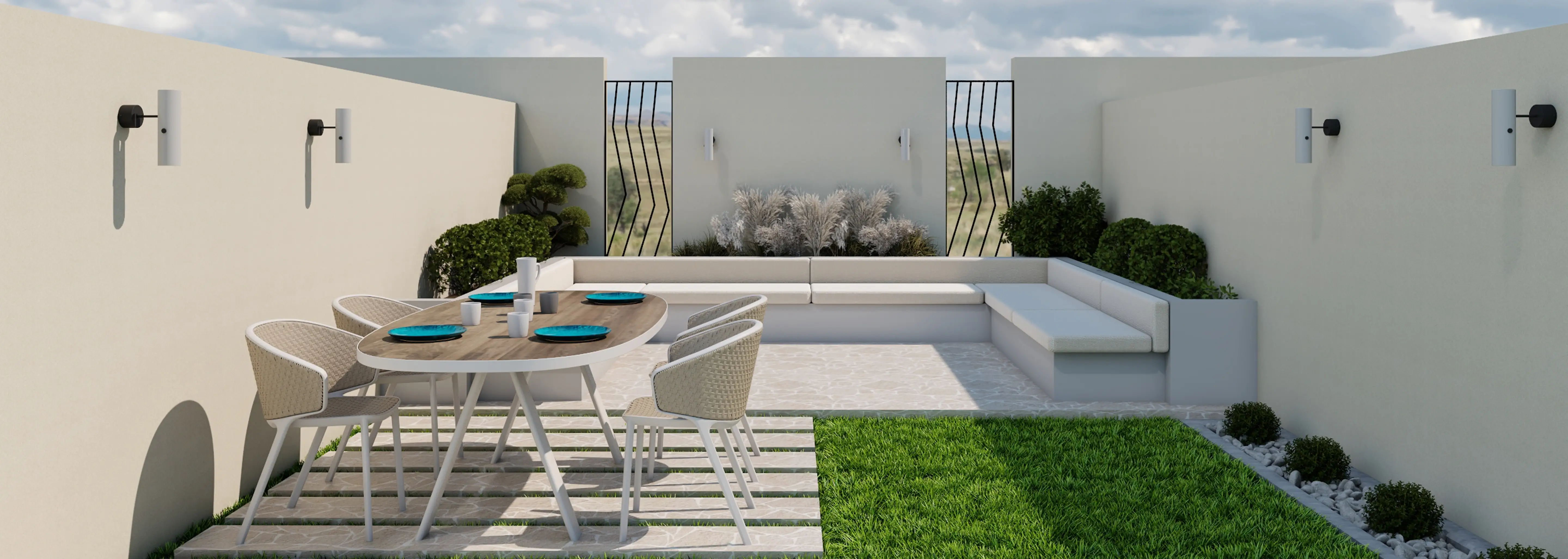 A French-classic kitchen design with white cabinetry, marble countertops, gold accents, and a central island with teal velvet stools. It connects to an outdoor space with a wooden dining table, soft lighting, and a stylish metal railing for privacy.