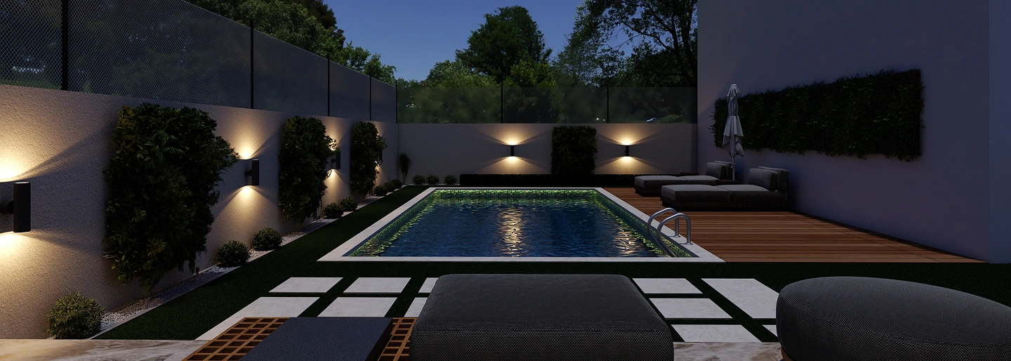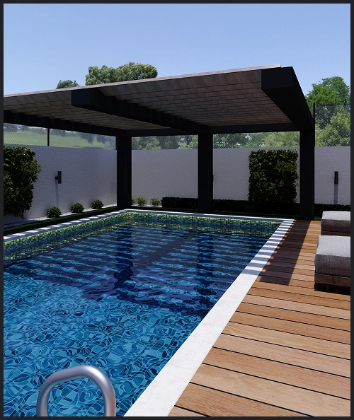 A lush outdoor retreat with a modern swimming pool, manicured green spaces, a shaded lounge area, and well-planned layouts to maximize comfort and functionality while maintaining a seamless blend of nature and architecture.