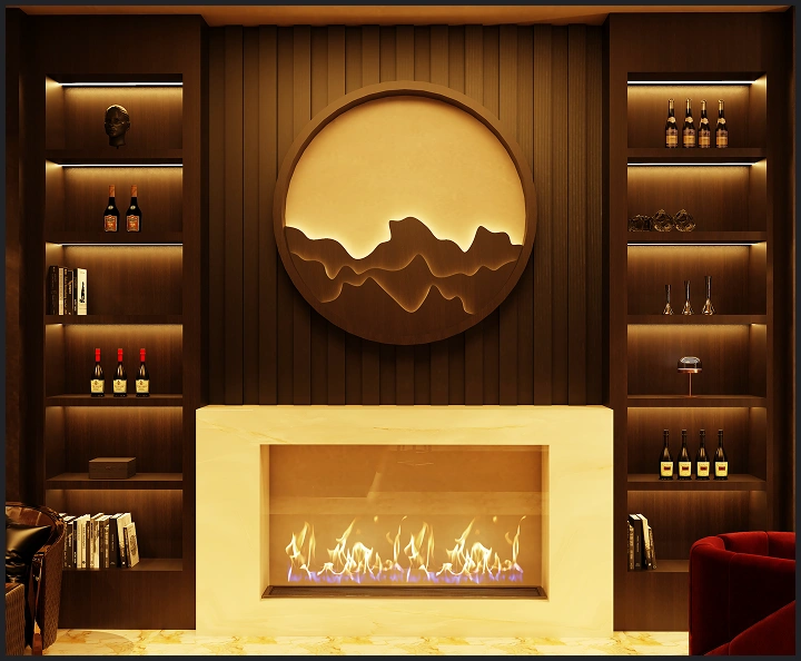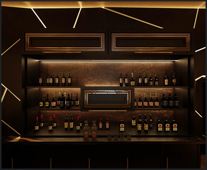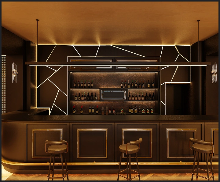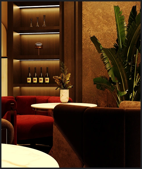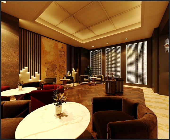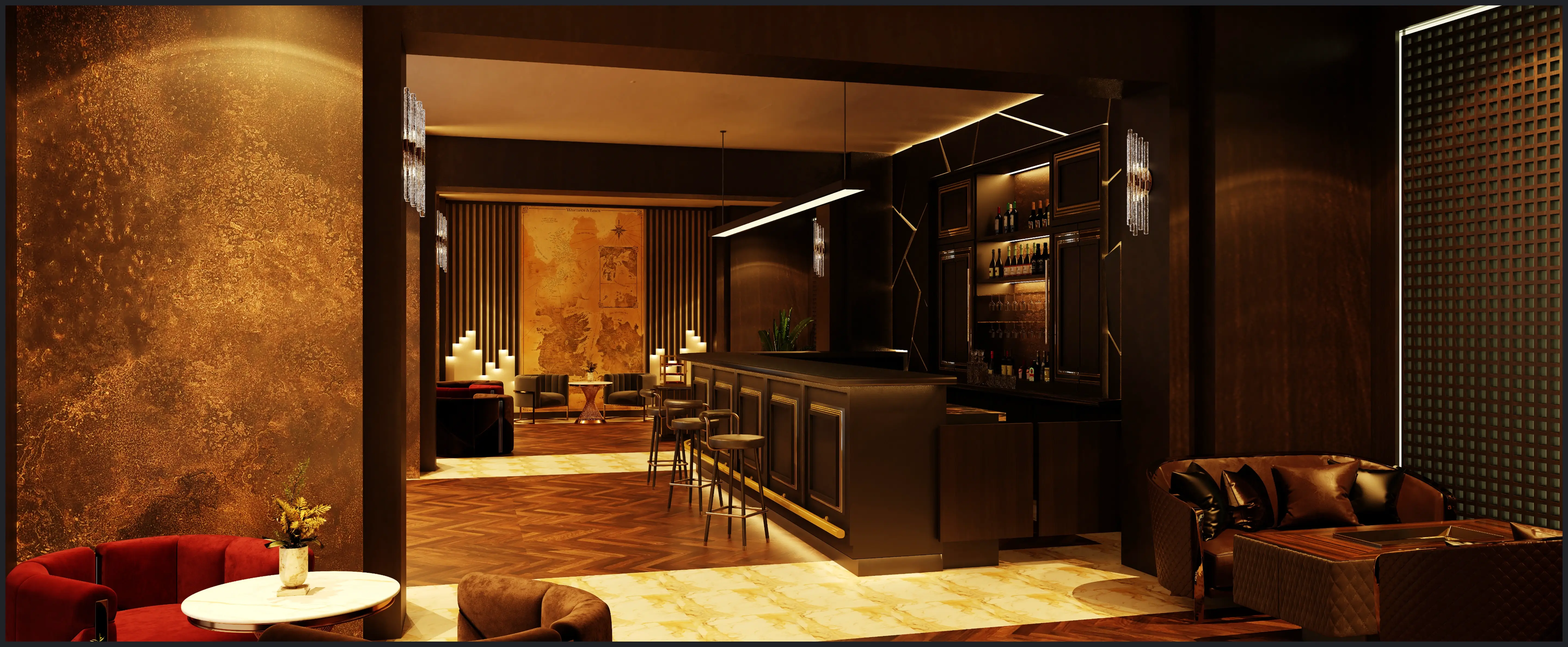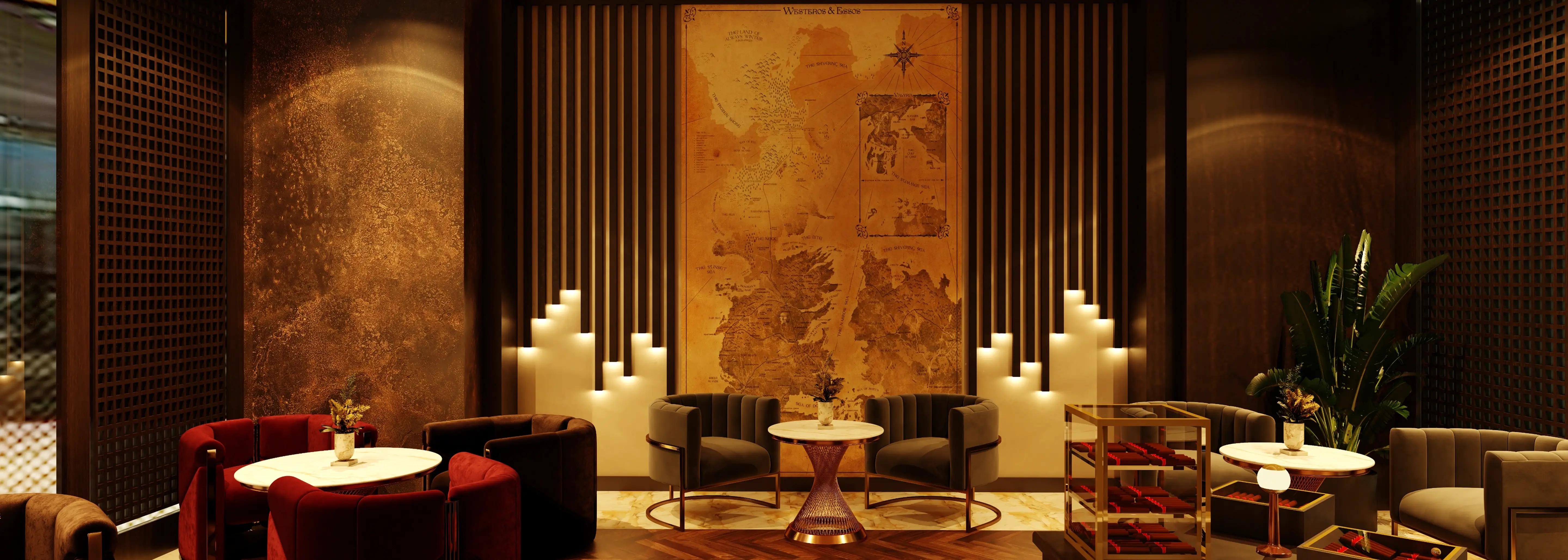 A cigar lounge inspired by Game of Thrones, featuring a dramatic entrance with a Westeros map, plush seating, a luxurious black marble bar, herringbone wood flooring, and atmospheric lighting for an elegant yet cozy ambiance.